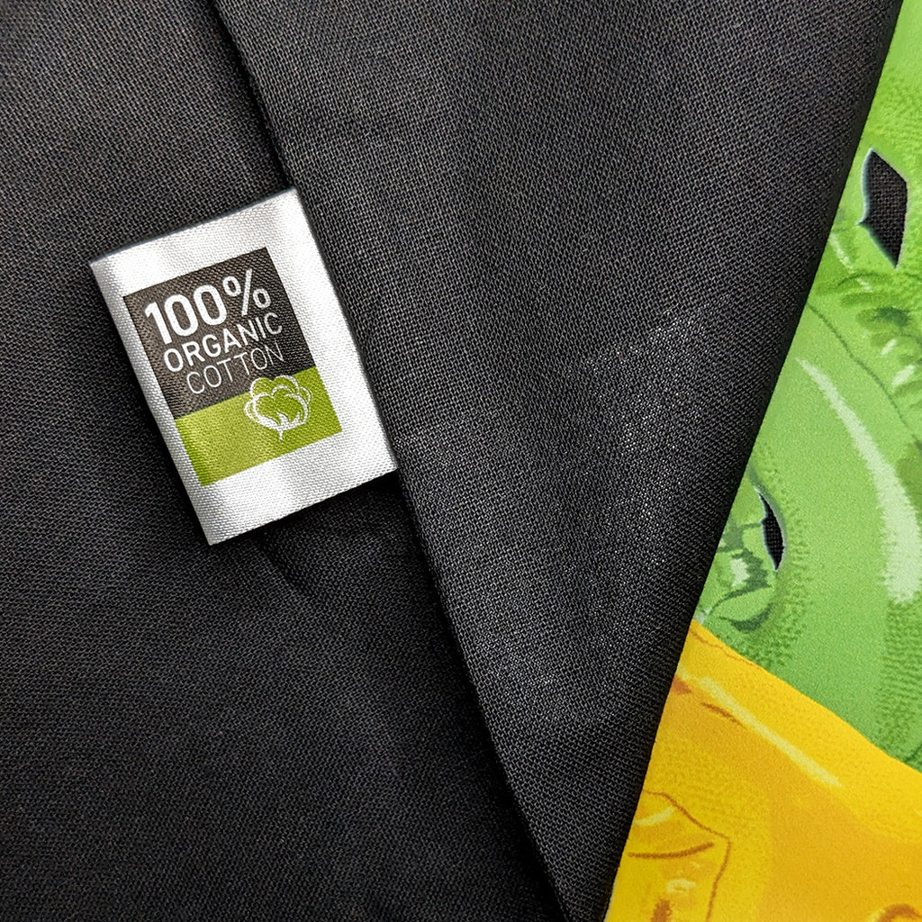 Black cotton tote bag with TDF print. The bag is fair trade, 100% organic cotton, size A3, original, has an eye-catching design and is full of urban chic. Perfect for grocery shopping, carrying books to school, and a clear fashion statement.