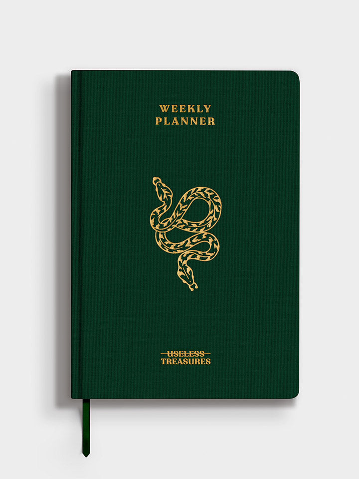 The Perfect Planner is a weekly planner with a hard fabric cover, gold details, and a fabric bookmark. The planner has inner front and back printed covers, and it's just a beauty. It includes 64 weekly spreads, notes, and checklists printed on ivory-colored pages. The planner has an easy flat opening and an envelope on the back to keep receipts, cards, spells, etc., close. Well, yes. It's perfect.