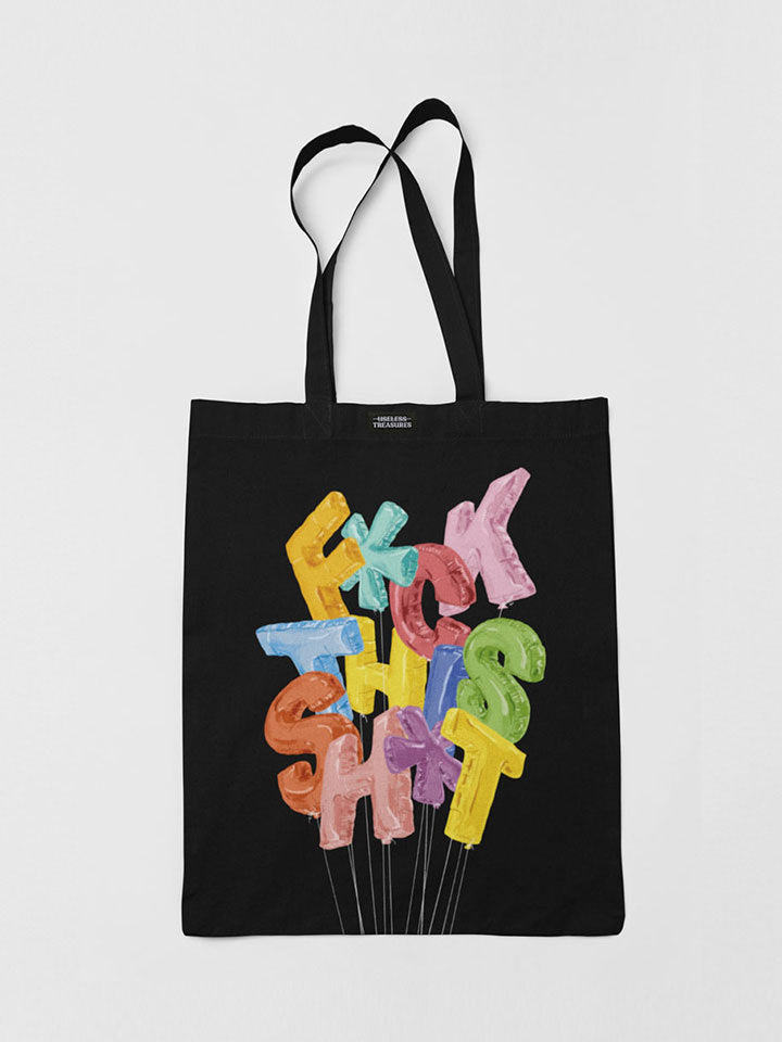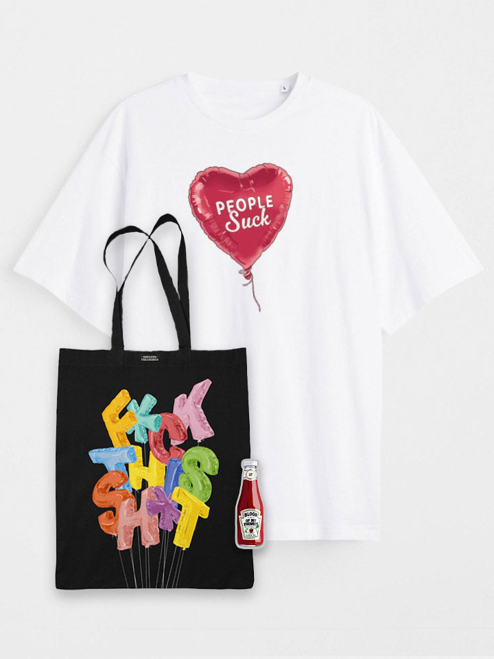 Includes an oversized, front print organic cotton t-shirt, an organic black printed tote bag, and an extra durable semi-clear sticker (size 12x3.5cm).