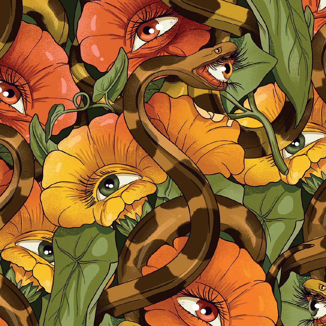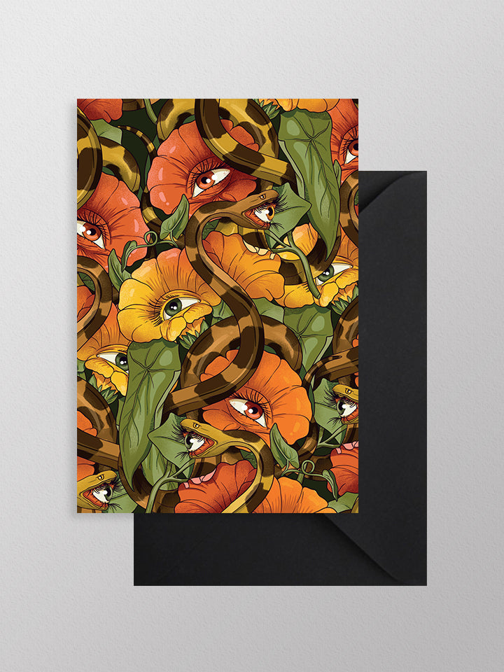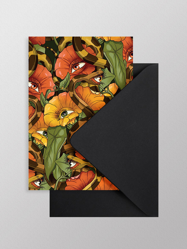 A6 postcard with surreal floral design. Size 10X15cm, Printed on a beautiful light grey recycled 300gr paper. The postcard is dotted on the back for neat and easy writing, sold with a black paper envelope, made for love letters only.