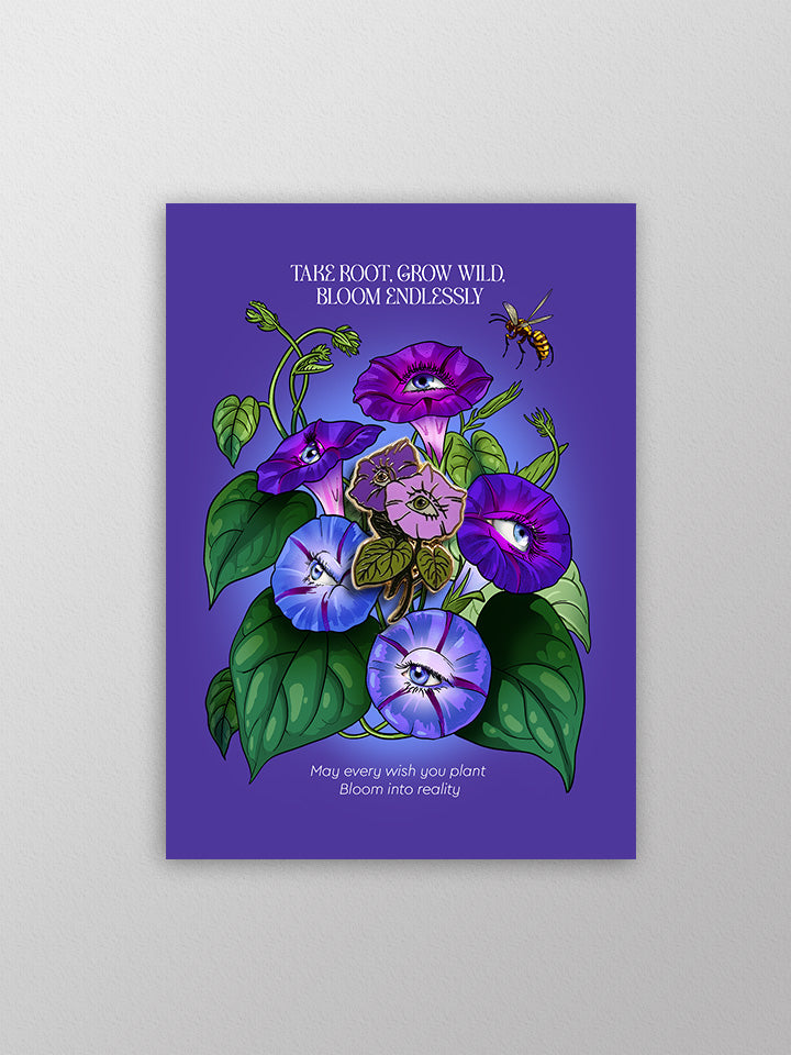 Celebrate style and sentiment with this beautifully designed enamel pin paired with a matching illustrated postcard. Featuring a delicate morning glory flower with watchful eyes, this duo carries an empowering and loving message to brighten anyone's day. Perfect as a thoughtful gift for loved ones or a chic addition to your collection. Surprise and inspire with this one-of-a-kind keepsake!