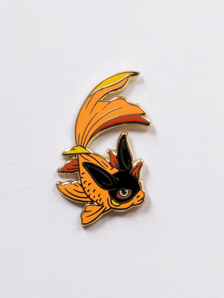 Celebrate style and sentiment with this beautifully designed enamel pin paired with a matching illustrated postcard. Featuring a playful goldfish in a black bunny mask, this duo carries an empowering and loving message to brighten anyone's day. Perfect as a thoughtful gift for loved ones or a chic addition to your collection. Surprise and inspire with this one-of-a-kind keepsake!.