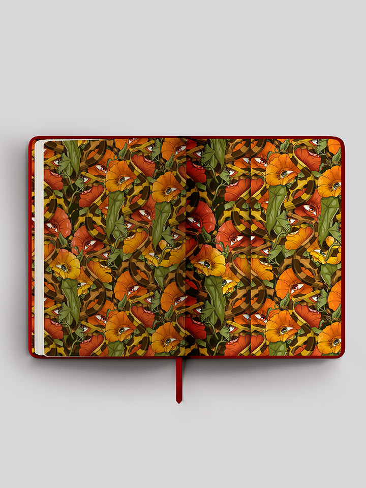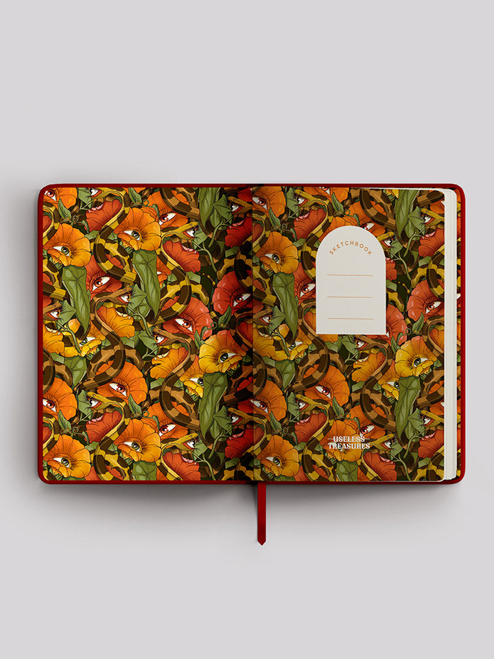 Our Sketchbook is a hardcover book for sketching, writing, and manifesting. It has 112 blank pages and 150 ivory-colored paper. Available in two cover fabric colors, Black and hot red, with a matching fabric bookmark and inner front and back printed covers. The sketchbook has an easy flat opening and an envelope on the back to keep receipts, cards, spells, etc., close— the perfect gift for any artist or artist at heart.