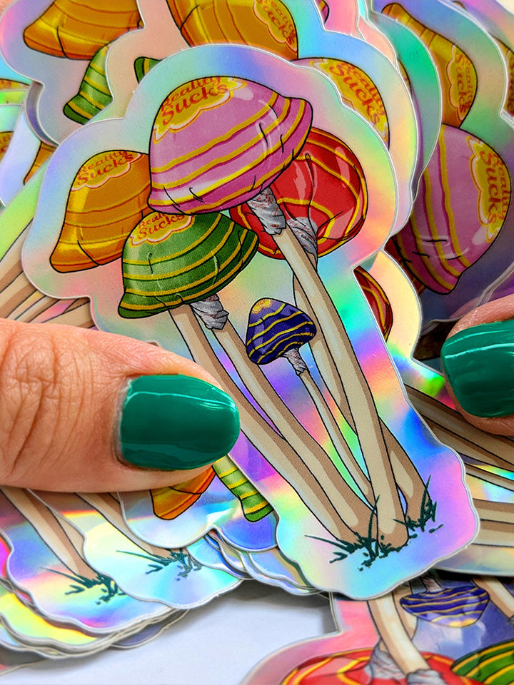 "Reality Sucks" Holographic sticker Size 7.5x4.5 cm. Add some magic to your every day. Made in Europe. Warped with a paper bag. Exclusive to this shop only,
