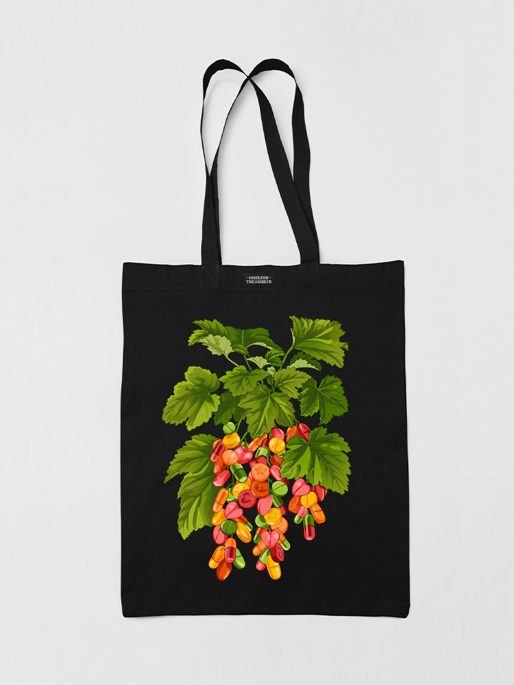 Black cotton tote bag with TDF print. The bag is fair trade, 100% organic cotton, size A3, original, has an eye-catching design and is full of urban chic. Perfect for grocery shopping, carrying books to school, and a clear fashion statement.