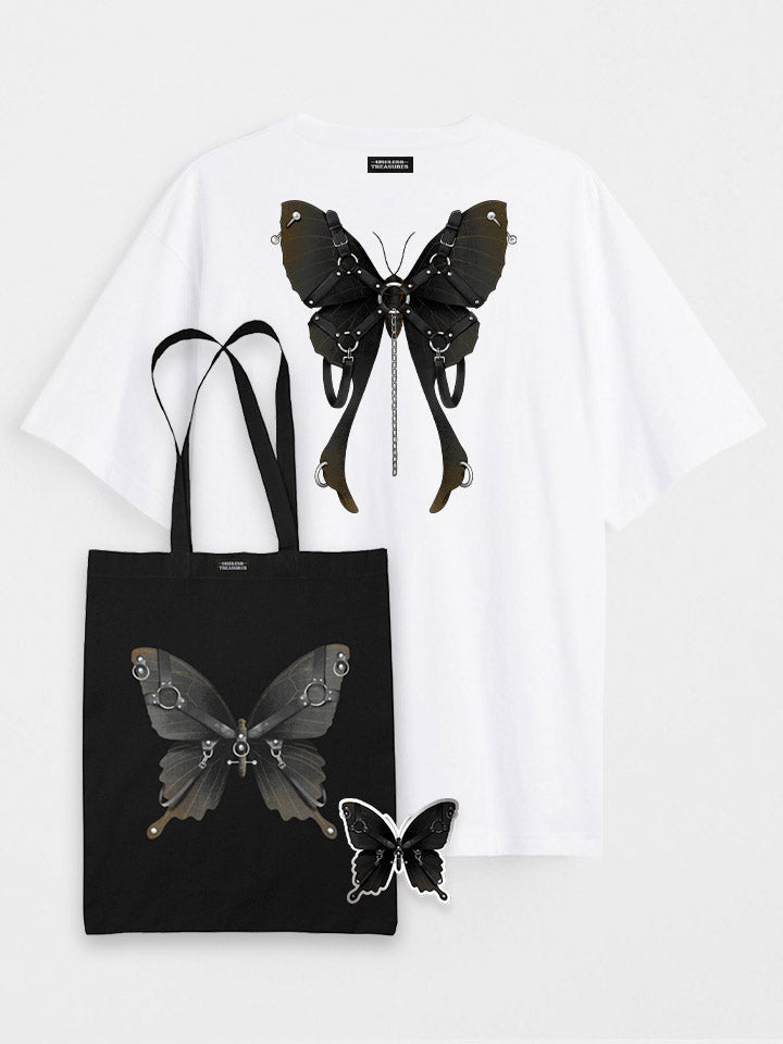 Includes an oversized, back print organic cotton t-shirt, an organic black printed tote bag, and a shiny extra durable metallic sticker (size 7x6cm).