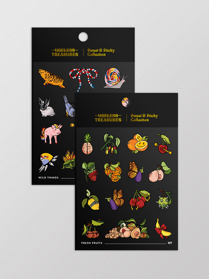 “Natural Beauties” Imaginary weed and mushrooms illustrated collection - two A6 sticker set. Tiny, super cute semi-transparent stickers on a transparent sheet. Wrapped individually with a black paperback with golden details.