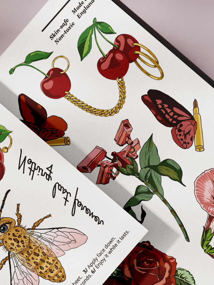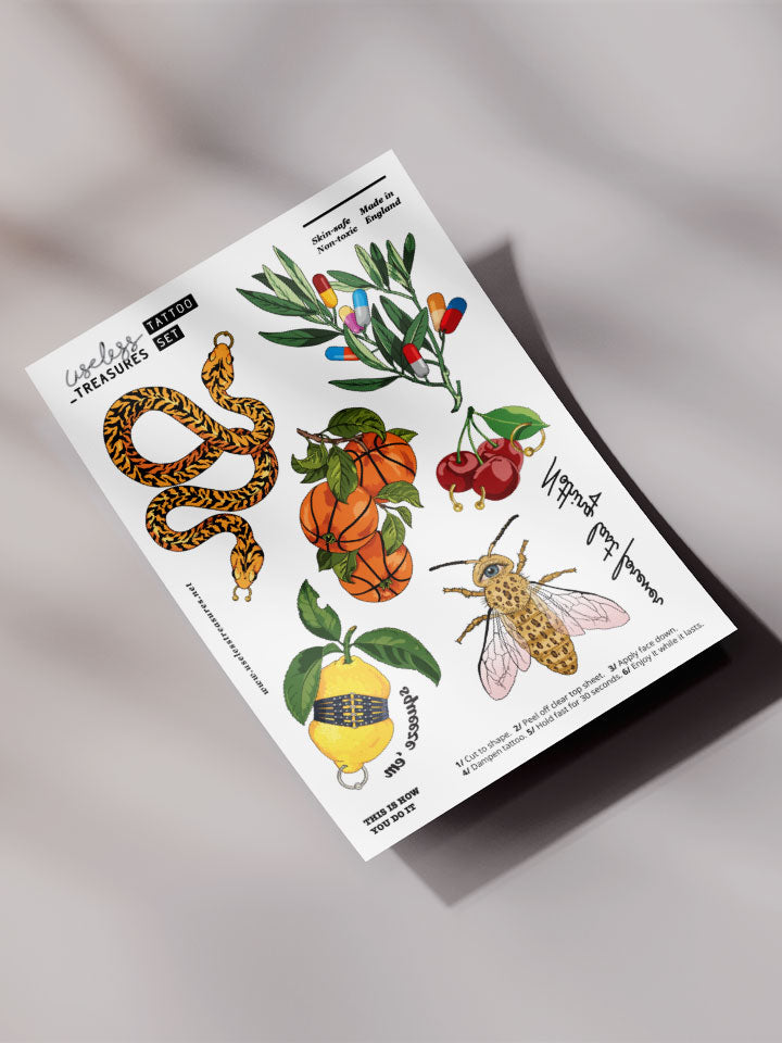 Two A5 temporary tattoos, skin-safe, and non-toxic.
