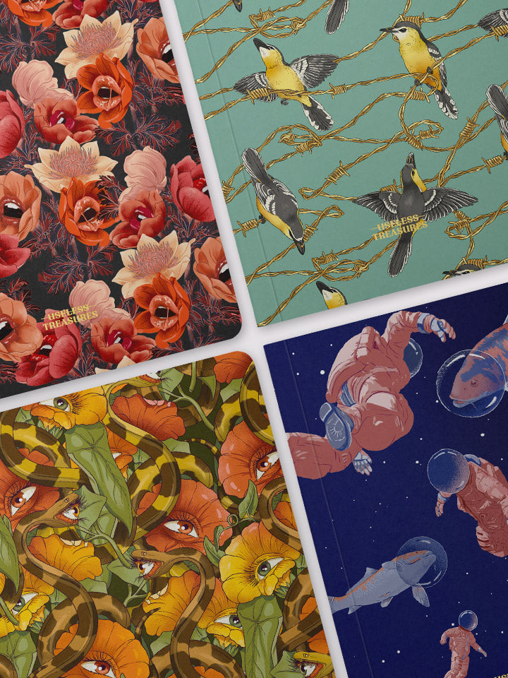 Includes the complete set of our A5 notebooks with Nature-inspired surreal designs. Each notebook has full-color printed covers with gold foil accents and eye-pleasing ivory-colored lightly dotted pages.